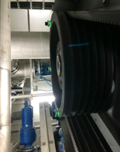 The below photo is from the same site where belt “powders” or pieces where found. We can clearly see the pulley is misaligned by a 3-5 mm. This was impossible to detect with thread or straight edge method!